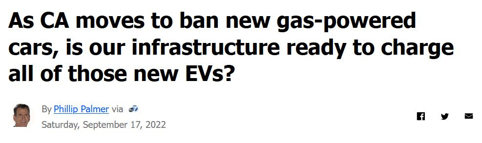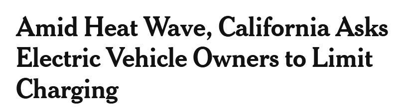 Imagine that money and the production of new EVs is no problem. I.e. we have unlimited copper, lithium, cobalt, etc. Could we just swap every gas car for an EV and call it the world’s greatest day ever? Well, no… The infrastructure is not in place for that transition. Only 20% of all new cars sold in California are electric yet the state’s grid is already overloaded.