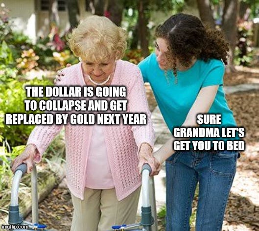 America prints too much money, therefore dollar collapse. As if China, Japan, Britain and the EU never do QE?
